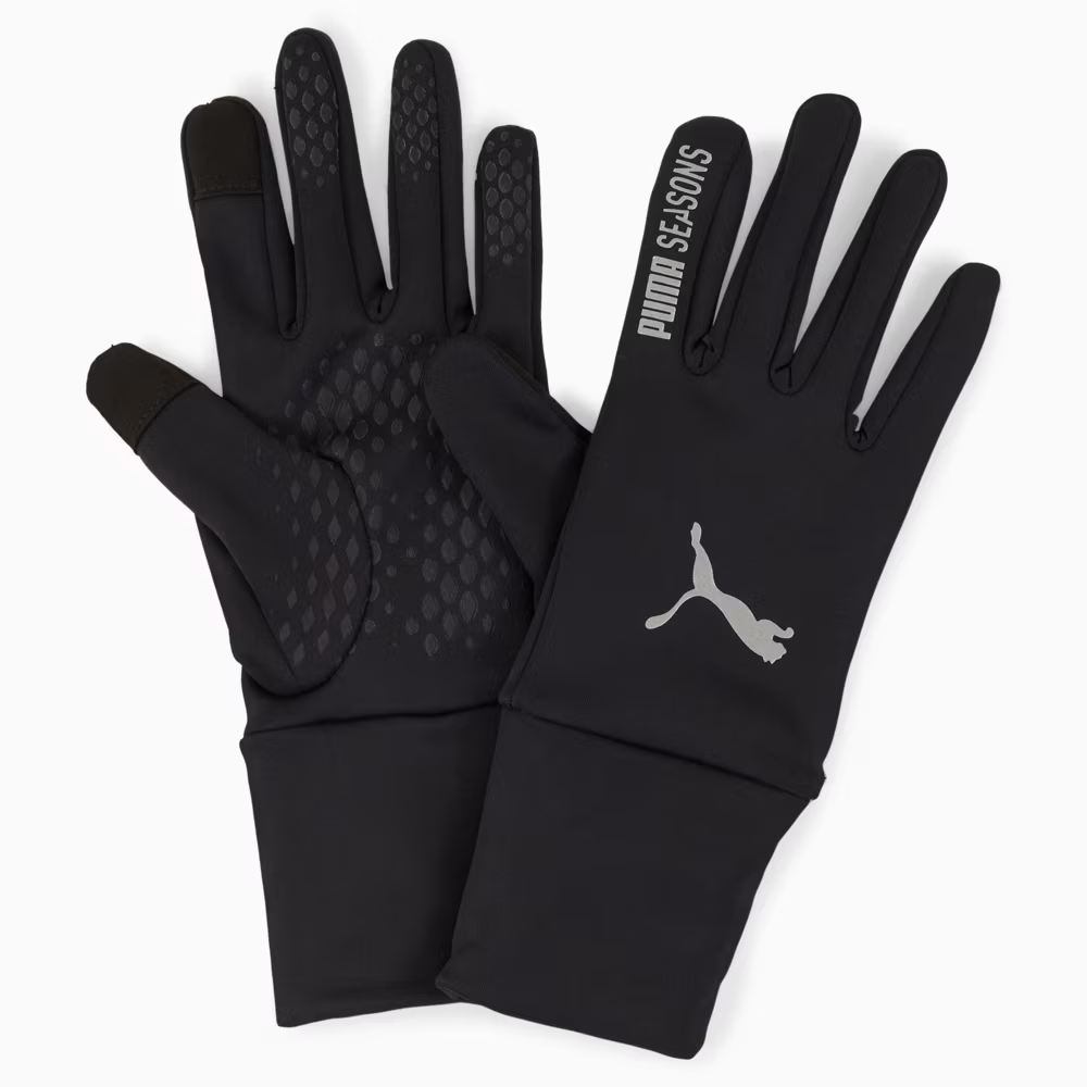 Перчатки Unisex SEASONS gloves от Puma. Флисовая подкладка. Нескользящий силикон на ладонях. Пальцы, реагирующие на сенсор. Светоотражающие детали. Детали фирменного оформления PUMA.