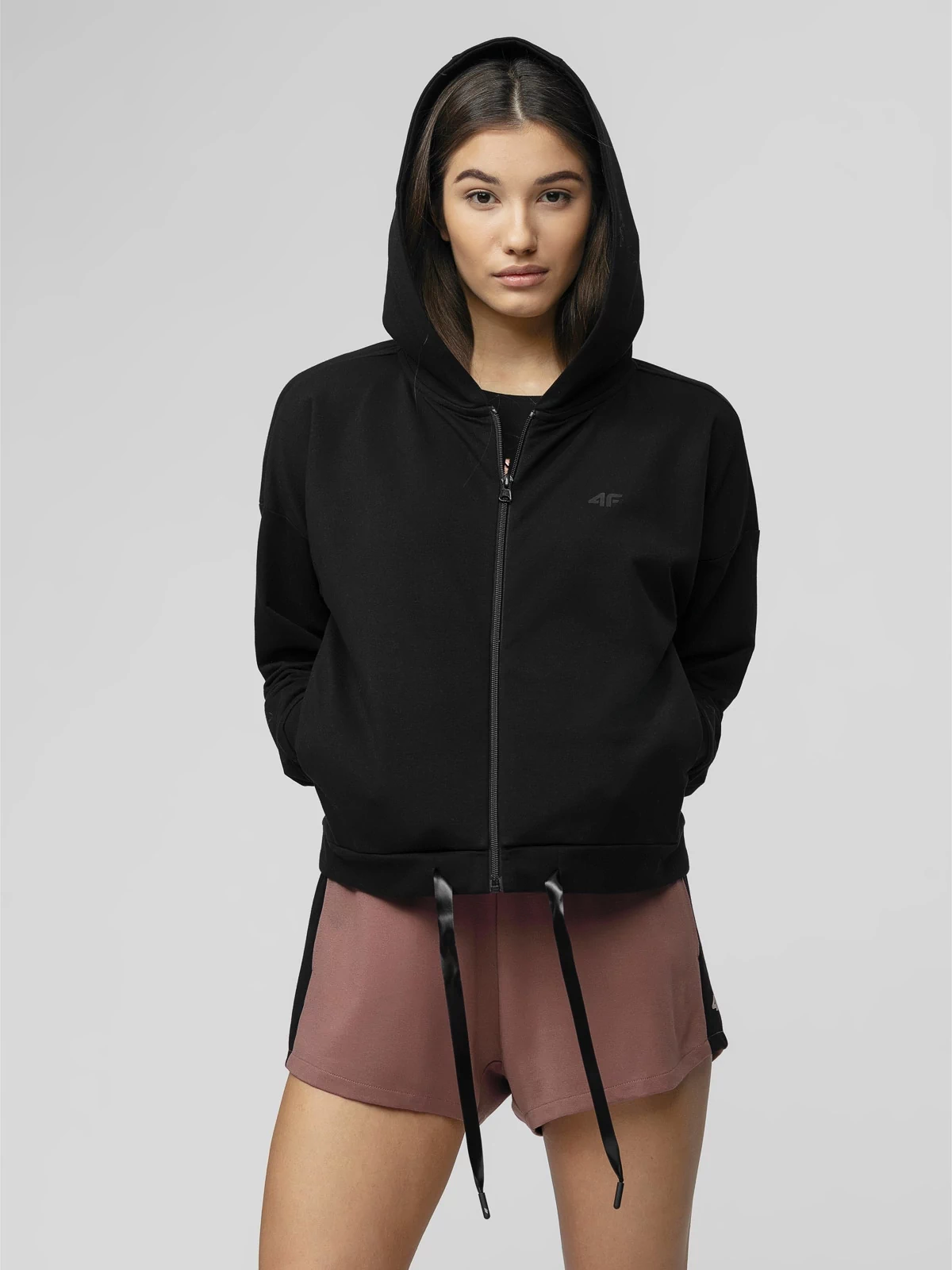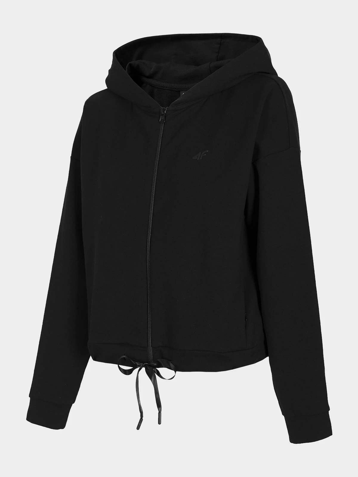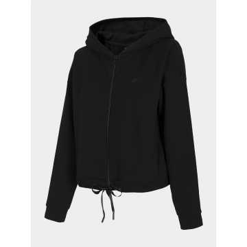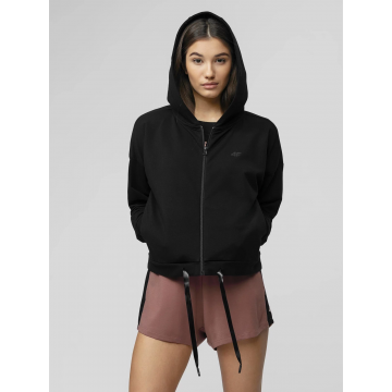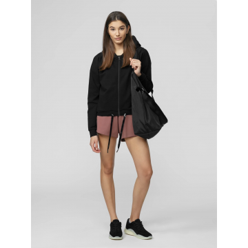 Стильная женская толстовка от 4F. Отлично подойдет для занятий спортом летом и весной. Изделие имеет застежку-молнию, карманы, капюшон, затяжку снизу и логотип.