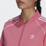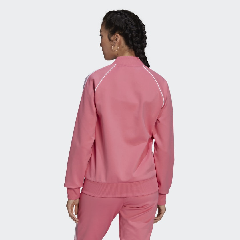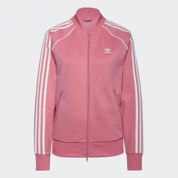 Женская олимпийка обычной посадки от Adidas. Изделие имеет воротник в рубчик, боковые карманы на молнии, застежку-молнию по всей длине, ребристые манжеты и нижний край.