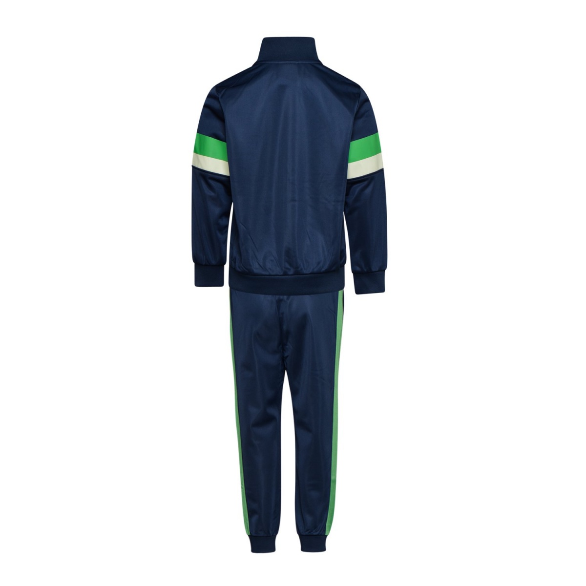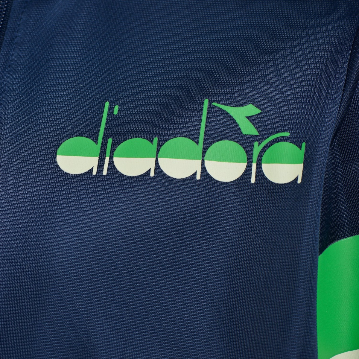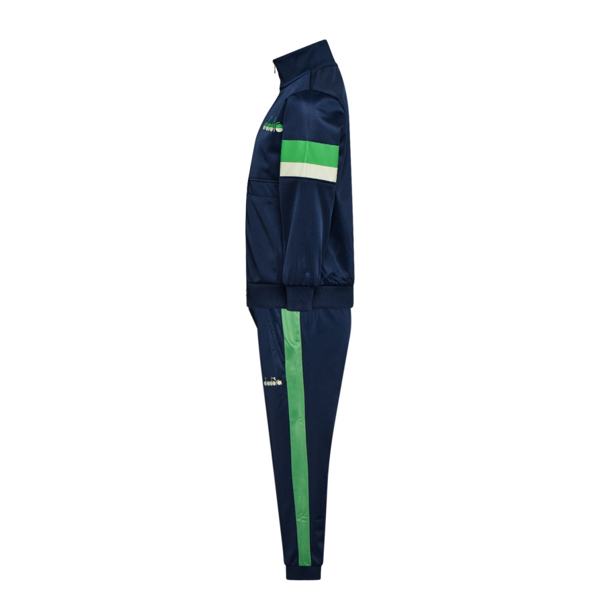 Спортивный костюм стандартного кроя со спортивной курткой и джоггерами. Джоггеры имеют манжеты, эластичную талию и щиколотки. Застежка-молния во всю длину, логотип Diadora и цветные полосы по бокам брюк. Состав - 100% полиэстер.