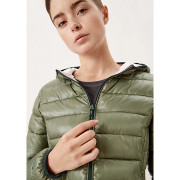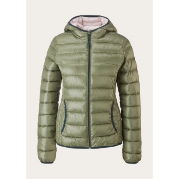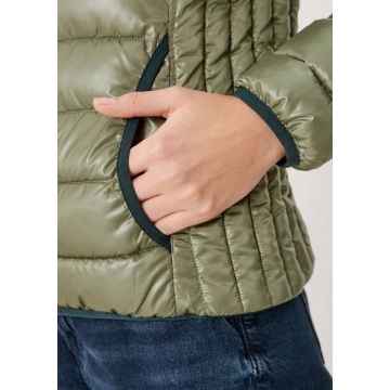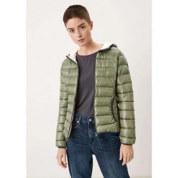 Женская короткая куртка классического кроя от Q/S by s.Oliver. Изделие имеет стеганую текстуру, застежку-молнию, капюшон на подкладке, воротник-стойку и длинные рукава.