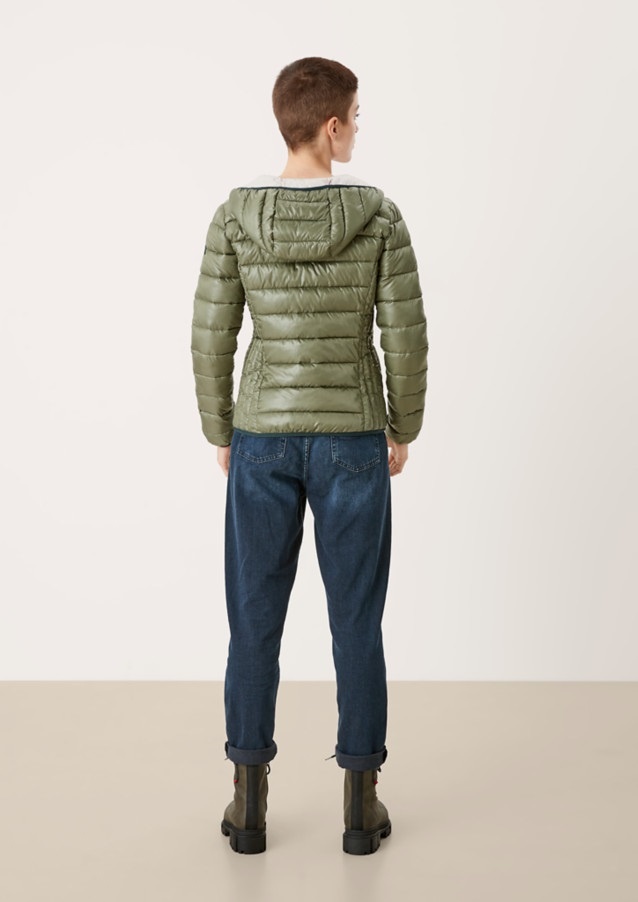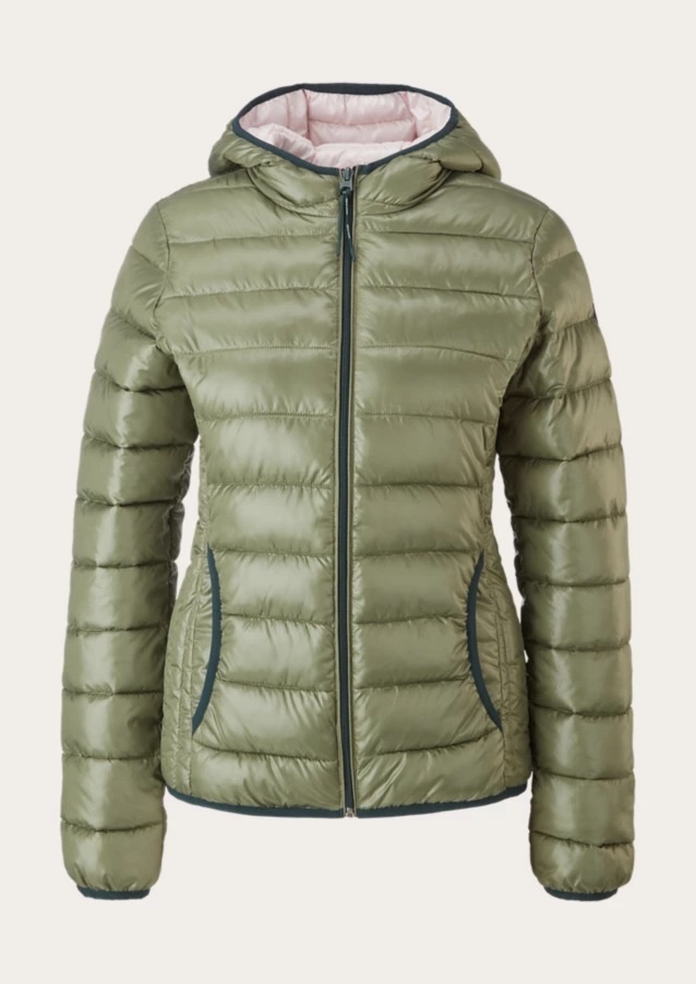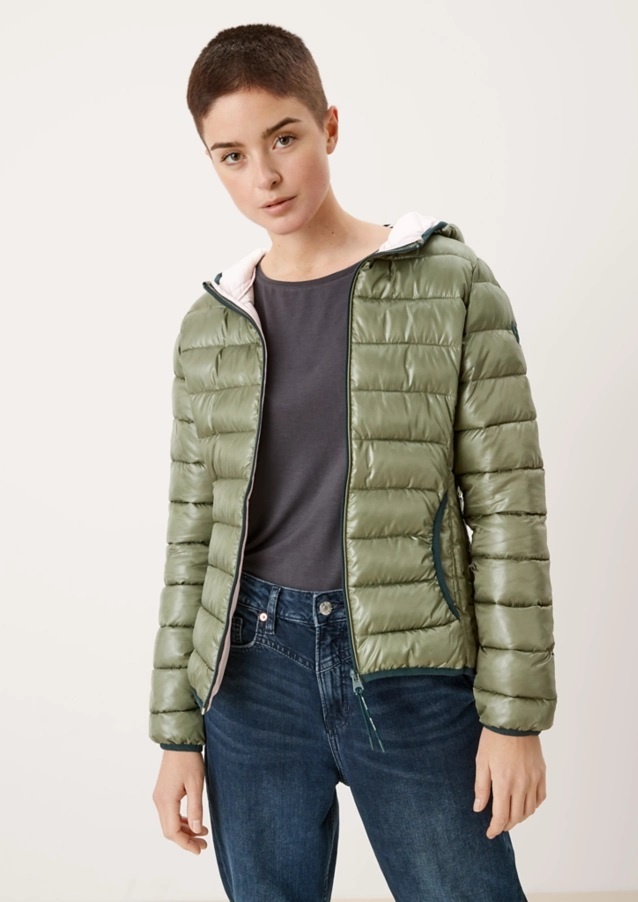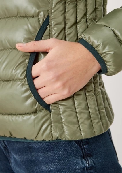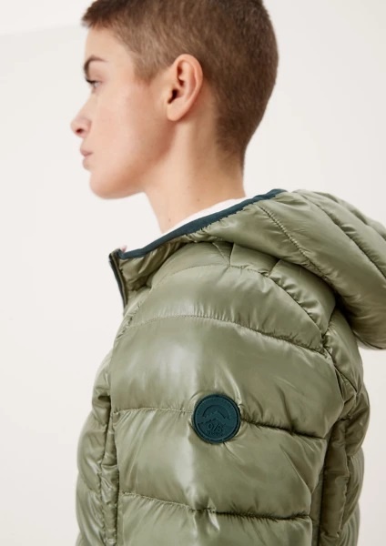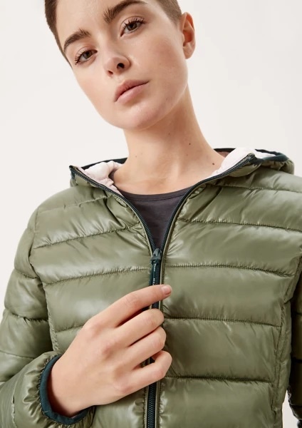Женская короткая куртка классического кроя от Q/S by s.Oliver. Изделие имеет стеганую текстуру, застежку-молнию, капюшон на подкладке, воротник-стойку и длинные рукава.