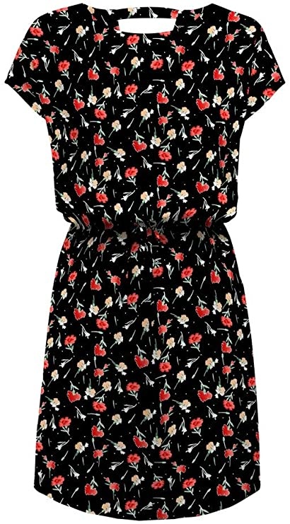 Женское платье с узором от ONLY. Изделие имеет эластичную талию, V-образный вырез сзади, круглый вырез и короткие рукава-крылышки.