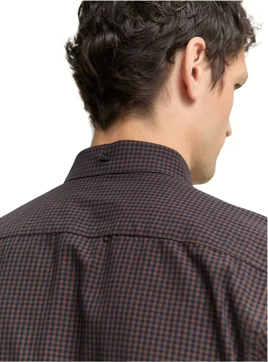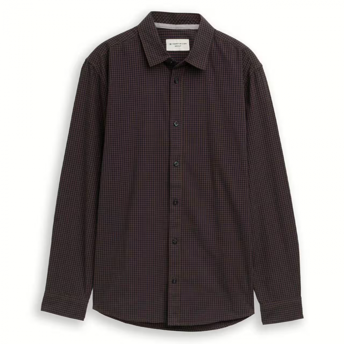 Мужская рубашка ДР Men's Shirt от Tom Tailor. Клетчатая рубашка с длинными рукавами, воротником, передней частью и манжетами на пуговицах и этикеткой с логотипом Tom Tailor. Изделие имеет обычный крой.