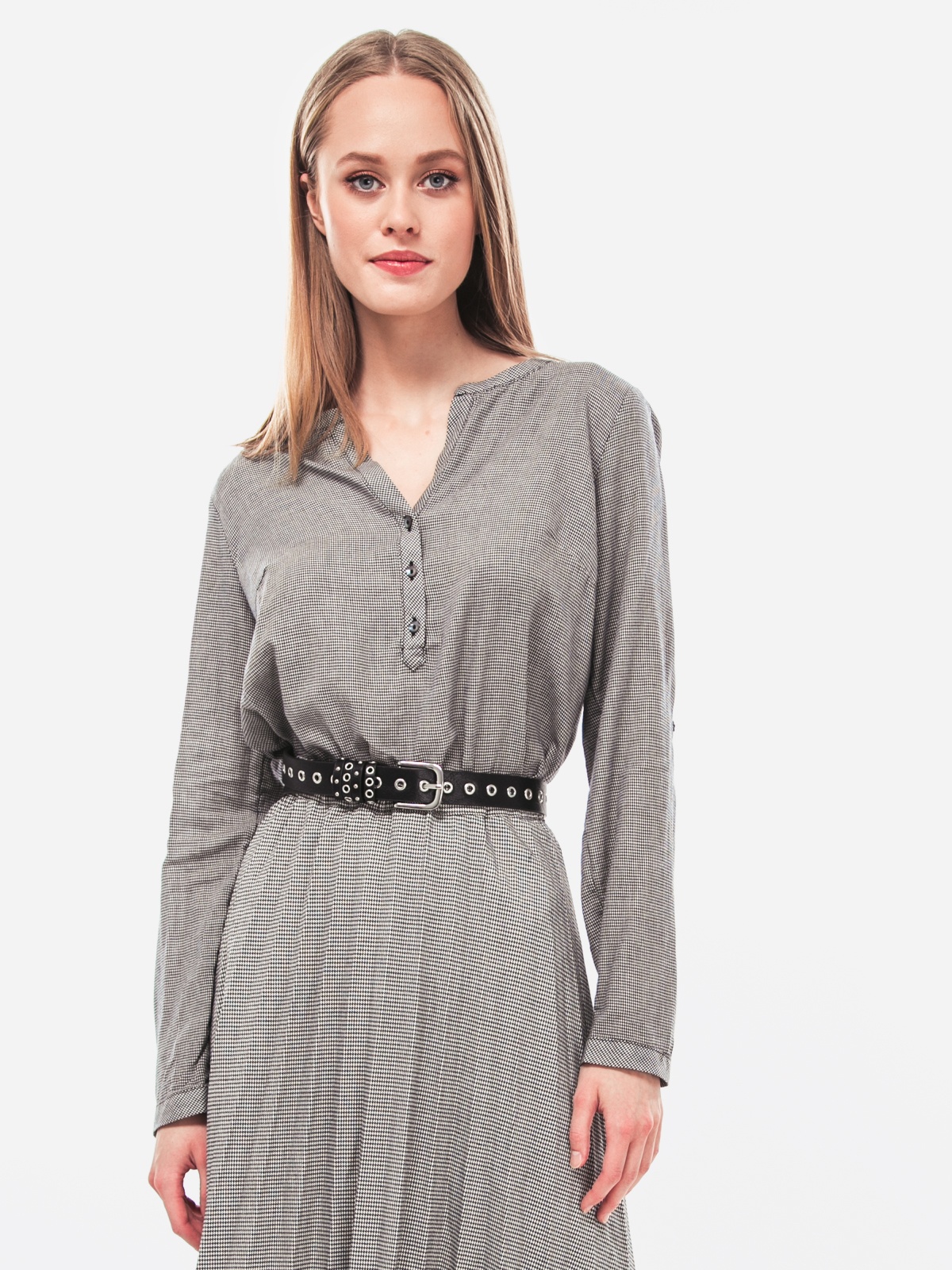Женская блуза прямого кроя от Tom Tailor. Изделие имеет V-образный воротник и застежку кнопку спереди. Также, есть длинные рукава на пуговицах. Состав - 100% хлопок.