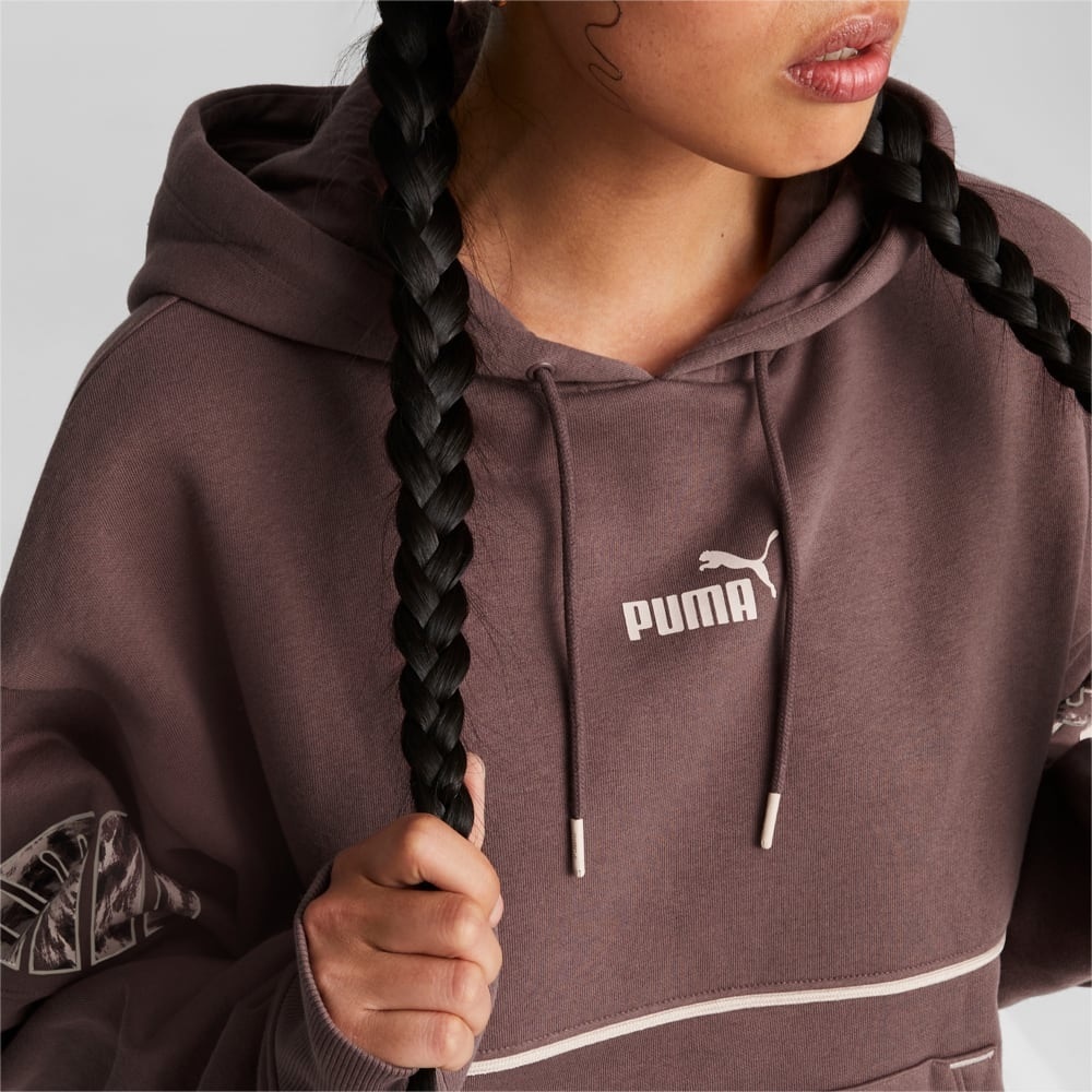 Жіноча толстовка комфортної посадки від Puma. Виріб має кишеню кенгуру, графічний логотип на рукавах і логотип на грудях.